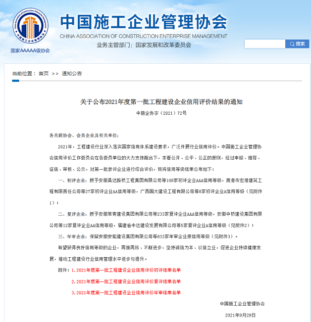 近日,在中国施工企业管理协会召开的2021年度工程建设诚信企业推介大会上,公司再次获得 “2021年度工程建设AAA信用等级企业”和“2021年工程信用7星级企业”等共二项荣誉,这也是“十四五”开局之年公司全面贯彻新发展理念、构建信用新发展格局在行业信用体系建设方面取得的突出成效。2021年,公司不断完善信用体系,强化信用导向,企业管理水平和社会信誉度不断提升。今后公司将以此为契机,不断总结经验,补齐发展短板,助力企业高质量发展。