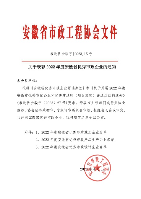 近日,安徽省市政工程协会公布了“2022年度安徽省优秀市政施工企业”名单。黄山建工集团股份有限公司被安徽省市政协会评为“2022年度安徽省优秀市政企业”。该项荣誉是由各市主管部门或行业协会推荐,经省市政协会秘书处初审,专家评审委员会审核,安徽省市政工程协会最终审定。