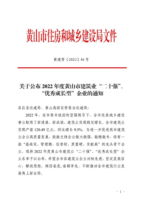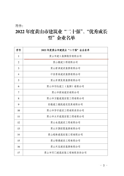 近日,黄山市住房和城乡建设局发布的《2022年度黄山市建筑业二十强企名单》中,黄山建工集团股份有限公司荣获2022年“黄山市建筑业企业二十强”。