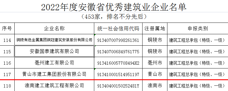 近日,安徽省住房和城乡建设厅发布了“2022年度安徽省优秀建筑业企业”名单,黄山建工集团凭借企业经营发展、管理创新能力、企业建造能力、企业文化建设、社会责任履行等方面的卓越表现再次名列榜单――建筑工程总承包类(特级、一级类别)省优秀建筑业企业,连续多年斩获该项殊荣。