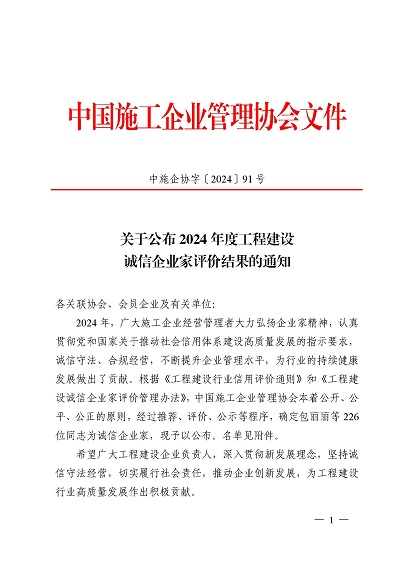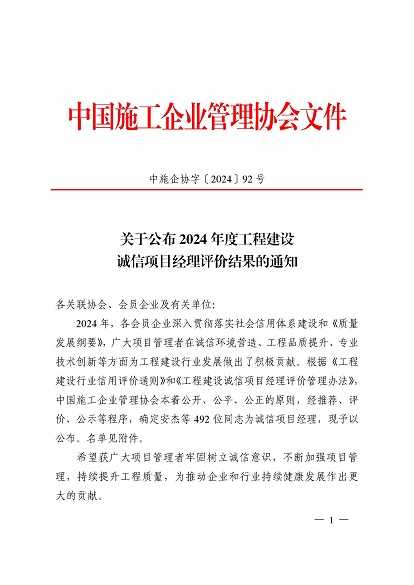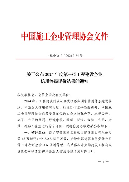近日,中国施工企业管理协会公布了2024年度第一批工程建设企业信用等级评价结果的通知、工程建设诚信企业家评价结果、工程建设诚信项目经理名单。黄山建工集团顺利通过AAA级信用企业的年审,继续保持AAA信用等级的殊荣。黄山建工集团总经理叶金发获评诚信企业家,项目经理毕星豪获评诚信项目经理。此次荣誉是对黄山建工集团在工程建设领域的综合实力和诚信经营的高度认可。