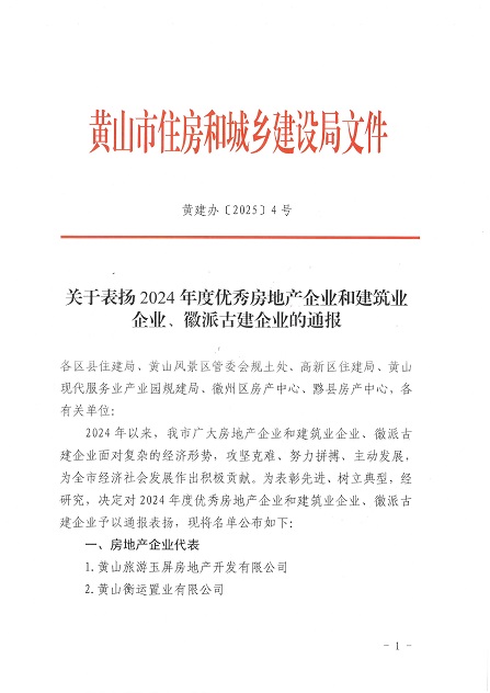 近日,黄山市住房和城乡建设局发布了《关于表扬2024年度优秀房地产企业和建筑业企业、徽派古建企业的通报》,黄山建工集团荣获2024年度优秀建筑业企业称号。